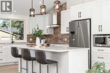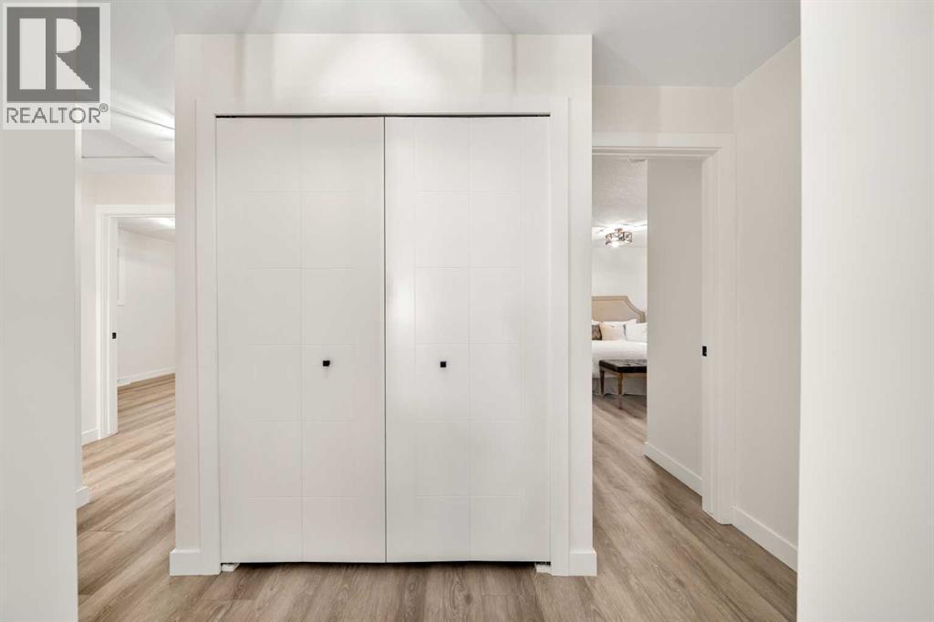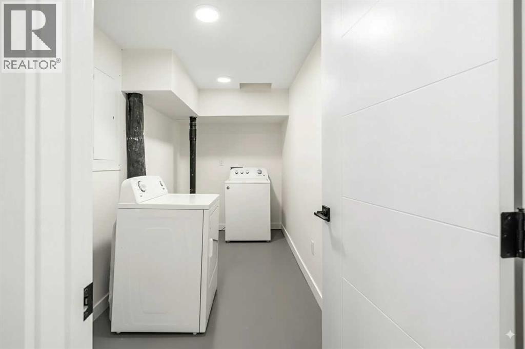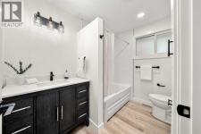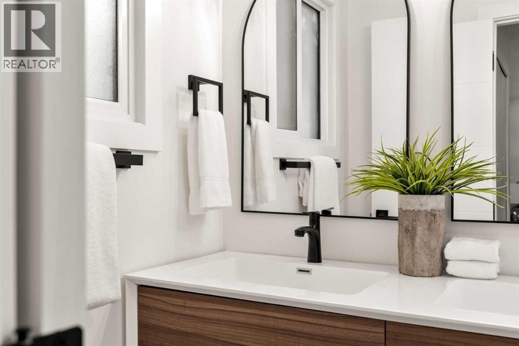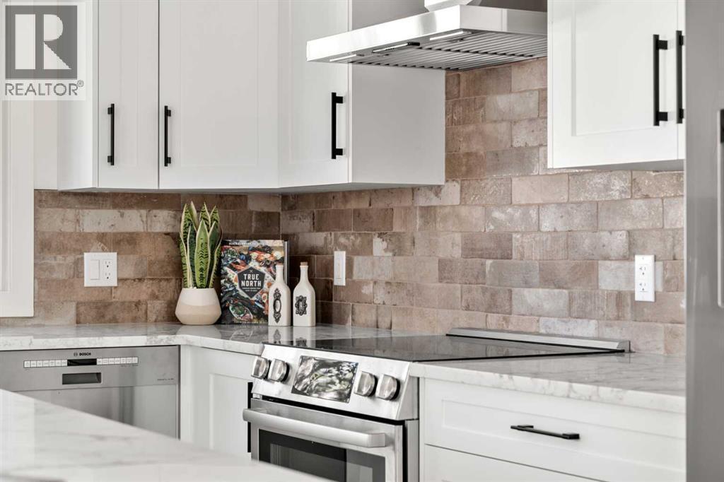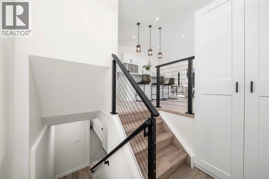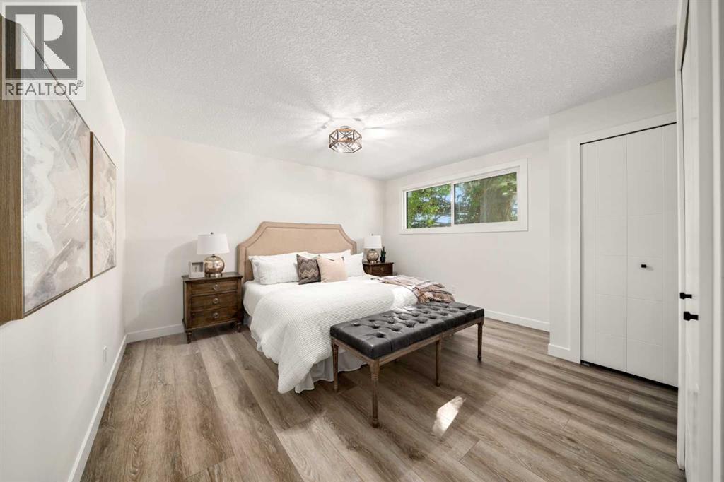 Welcome to BRENTWOOD, one of Calgary’s most beloved family communities, where this PERMITTED RENOVATION transforms a classic bungalow into a modern retreat. Set on a MASSIVE PIE LOT surrounded by mature trees, this residence combines mid-century character with today’s luxury upgrades for a lifestyle that is both stylish and functional. The main floor opens under soaring CATHEDRAL CEILINGS, where a bright front living room looks onto a quiet street through oversized windows. Wide-plank LVP FLOORING runs throughout, enhancing the clean lines of the OPEN CONCEPT LAYOUT. The chef-inspired kitchen is anchored by a large island with flush eating bar, STAINLESS STEEL APPLIANCES with a chimney hood fan, full-height cabinetry, and a BRICK CERAMIC BACKSPLASH. A defined DINING AREA comfortably fits a family table, creating a natural gathering hub for everyday life. The separate sleeping quarters offers three bedrooms, including a spacious PRIMARY SUITE with dual closets and a SPA-LIKE ENSUITE featuring a floating dual vanity and stand-up shower. Two additional bedrooms and a 4pc main bath with soaker tub complete this level, while a handy laundry chute adds convenience for busy families. Downstairs, the FULLY DEVELOPED BASEMENT offers incredible versatility with a large rec room designed for movie nights and games, plus the flexibility to convert part of the space into a 5th bedroom thanks to an existing egress window. this level also includes a 4th bedroom with walk-in closet, a modern 3pc bath with stand-up shower, dedicated laundry room, and abundant storage. Outdoors, the landscaped yard is a true retreat. An EXTERIOR BRICK FIREPLACE adds timeless charm for evenings under the trees, while a COVERED PATIO offers space to barbeque and unwind in every season. With room for a vegetable garden, a shed for storage, and plenty of green space for kids to play, this lot is both beautiful and functional. The DOUBLE DETACHED GARAGE IS INSULATED, HEATED, and features a new door and op ener, offering winter comfort and year-round utility. Families will love the walkable proximity to MULTIPLE LEVELS OF SCHOOLING, the UNIVERSITY OF CALGARY, BRENTWOOD LRT STATION, the public library, shopping centres, and community recreation. Nature enthusiasts will appreciate being just minutes from NOSE HILL PARK, one of Calgary’s largest green spaces. This renovated bungalow delivers the design quality of a modern luxury home while preserving the warmth of a family-friendly Brentwood location! (id:6769)