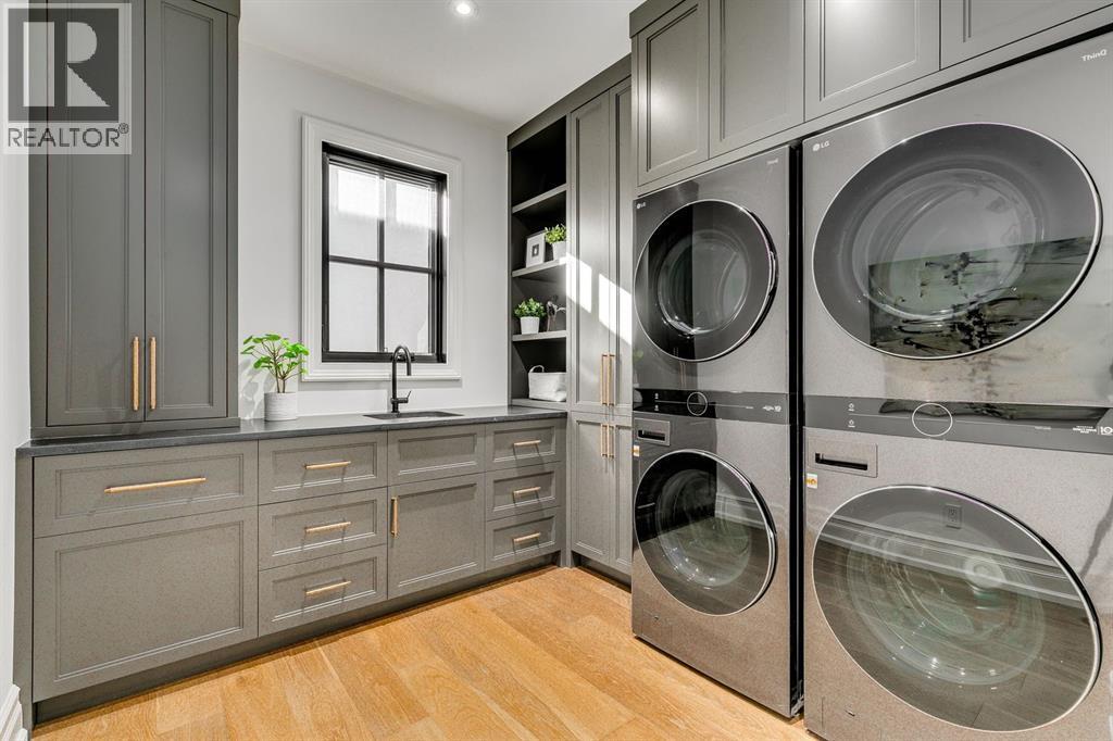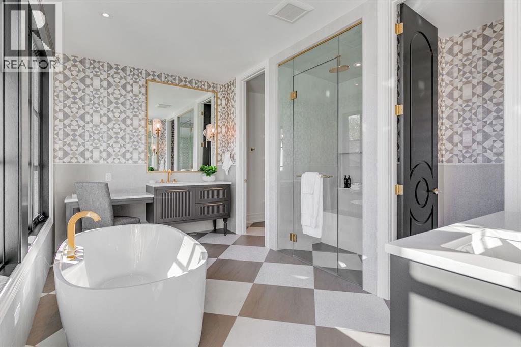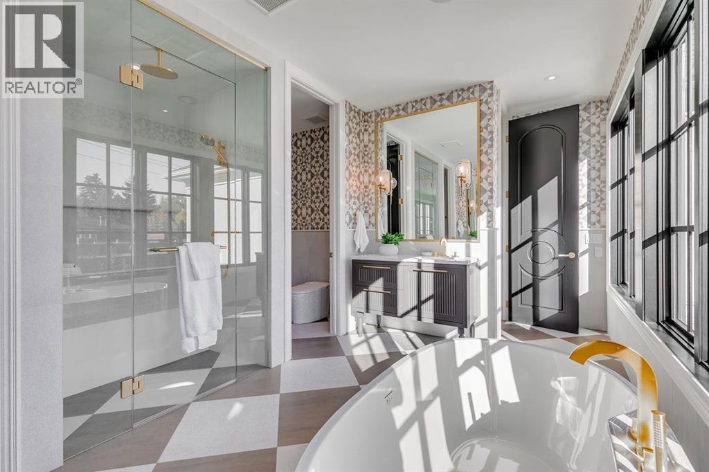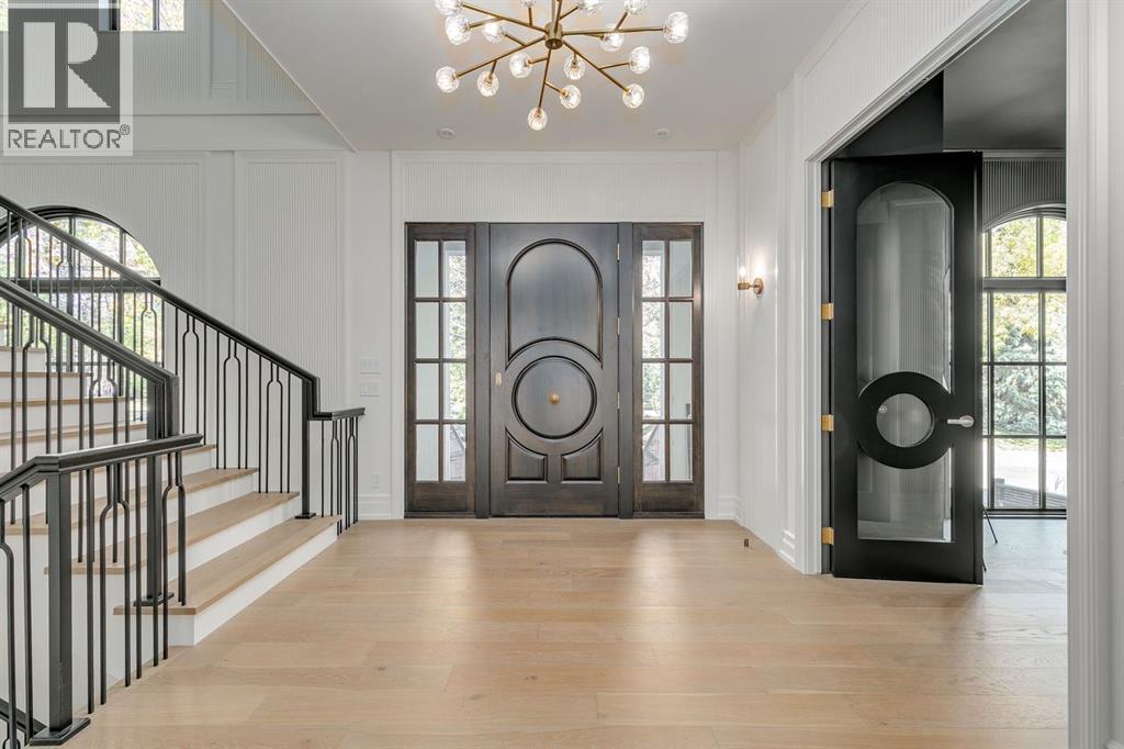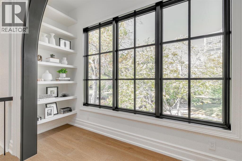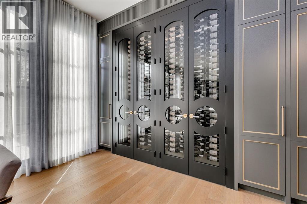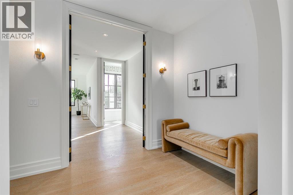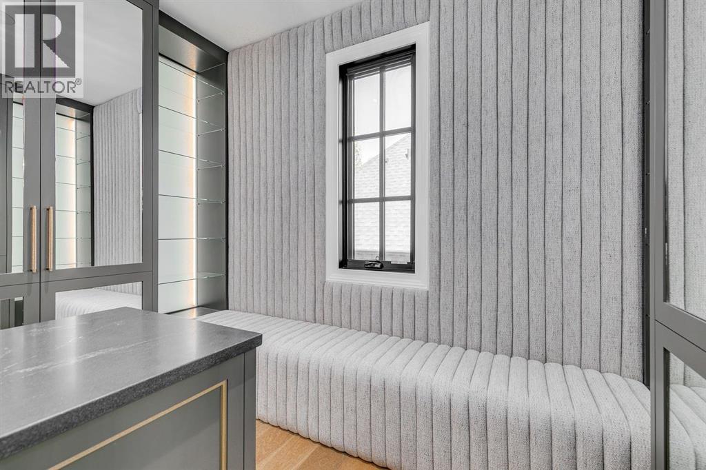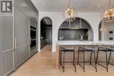 This masterfully crafted estate by Tyrrell Custom Homes is a true statement of elegance, nestled in the heart of Roxboro, one of Calgary’s most prestigious inner-city communities. Conceived by McDowell & Associates and elevated by the award winning Paul Lavoie Interior Design, this home is a seamless marriage of timeless architectural beauty and modern sophistication. From the moment you arrive, the home exudes refined grandeur with a stone and acrylic stucco exterior, a custom crafted front door, and expertly landscaped grounds featuring underground irrigation and a fully fenced yard. A snow melt driveway leads to the rare heated four car garage, while a private covered outdoor living room, complete with a wood burning fireplace, flush-mount heaters, and built-in speakers, sets the stage for year-round entertaining in style. Inside, the commitment to quality and detail is unmistakable. Soaring ceilings, custom white oak staircases, and herringbone patterned oak flooring create a backdrop of European flare with quiet luxury. Signature features such as a sculptural cast-stone fireplace mantle and bespoke finishes throughout showcase the home’s craftsmanship at every turn with. Designed for both everyday living and lavish entertaining, the open concept layout includes an elegant formal dining spaces with feature wine wall, and a dreamy kitchen equipped with Subzero and Wolf appliances, site built cabinetry, and a fully appointed butler’s pantry with secondary sink, dishwasher, and freezer. Upstairs, the opulent primary suite offers a private sanctuary with heated tile floors, a steam shower, freestanding soaker tub, and a designer dressing room featuring an island, bench seating, makeup vanity, mirrors, wallpaper accents, and a statement chandelier. Two additional bedrooms, a spacious upper level laundry room with dual washer/dryers, and thoughtful built-ins add both luxury and functionality. A charming library nook offers the perfect spot to unwind with a good book, while a spacious bonus room with vaulted ceilings provides flexibility and can easily be converted into a fourth bedroom. The lower level continues the theme of elevated living with a fifth bedroom, full bathroom, a mirrored fitness studio, and a custom wet bar that anchors the spacious rec room. A Viessmann boiler system with in-floor radiant heat, dual Carrier furnaces, smart thermostats, A/C, HRVs, central vac rough-in, and whole home automation wiring ensure the home is as high performing as it is beautiful. Every detail, right down to the epoxied heated garage floors and premium materials throughout has been thoughtfully curated to the highest standard. This is a rare opportunity to own a home that combines exceptional craftsmanship, technological innovation, and timeless European design, all within steps of the Elbow River and moments from downtown Calgary. (id:6769)