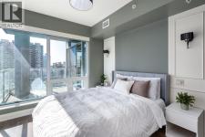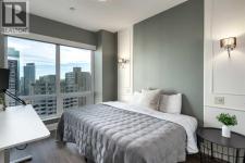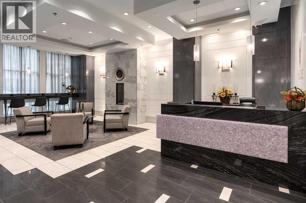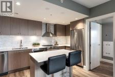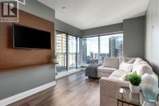 Experience elevated sophistication on the exclusive BEDOUIN Floor at Vogue! One of only four floors in the building with these premium upgrades, this gorgeous corner suite is soaked in natural light and showcasing panoramic views of the city skyline and Rocky Mountains. The BEDOUIN Collection offers refined details including designer lighting with dimmers, custom bedroom paneling with wall sconces, and premium finishes throughout.The open concept kitchen features two-tone cabinetry, quartz counters, under-cabinet lighting, a custom island with bar seating, tile backsplash, and upgraded stainless-steel appliances including a chimney-style hood fan. The chic living space is complete with a book matched built-in walnut entertainment unit. The sizeable corner balcony features a gas BBQ line, making BBQing a dream. The primary bedroom, wrapped in windows, features a spa-inspired ensuite with quartz countertops, tile floors, modern vanity with storage, and a full-height tiled tub/shower combo. The second bedroom offers flexibility as a guest room or home office and is steps from its own full bathroom with a floor-to-ceiling tiled shower and upgraded glass door. The bedrooms are ideally separated for ultimate privacy.Additional highlights include in-suite laundry with new dryer (2025), a titled secure heated underground parking stall with storage, and central A/C. Vogue offers an elegant, hotel-style lobby with full-time concierge plus exceptional amenities: a state-of-the-art fitness centre, yoga studio, billiards and party rooms, and the 36th-floor Sky Lounge with rooftop terraces and breathtaking 360° mountain and city views. Walk to Prince’s Island Park, Kensington Village, the LRT (free zone), boutique shops, fine dining, cafes, and Calgary’s +15 network—all just steps away. This is luxury urban living at its finest. (id:6769)