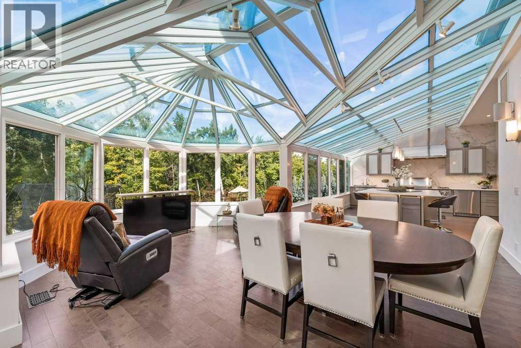 *Welcome to this extraordinary, fully renovated estate home in the prestigious community of Heritage Pointe, offering exclusive lake access and surrounded by natural forest beauty! Situated on a prime lot & backing onto a treed forest, the home has undergone a major renovation. It now features the addition of a spectacular 800 sq. ft. "entertainer's dream" 4 season sunroom (with new foundation and its own furnace/plumbing/air conditioning) - a true showpiece created for both relaxation and entertaining! Outfitted with premium appliances, the chef's kitchen serves large gatherings; a spacious dining room is adjacent, plus a living area for relaxation, where dual large-screen TV's seamlessly rise from the hardwood floors - at the touch of a button! The main home's central kitchen is renovated with new quartz counters/island, new appliances, marble backsplash, plus a newly reconfigured lighted pantry. With a living / dining room that has a new floor-to-ceiling feature "linear" fireplace, perfect ambience is createde. A stylish great room, also adjacent to the kitchen, provides built-in cabinetry with lighted accents. All new hardwood floors adorn the main level, new lighting, all solid interior doors, new carpets. A main floor office, half bath and mudroom complete the main level. The upper level currently features 4 bedrooms (could be bonus room with 3 bedrooms). The master suite showcases vaulted ceilings, a private sitting area overlooking the forest, spa-like 5 pc ensuite w/air jet tub, steam shower & large walk-in closet, heated floors! The professionally finished lower level features a 4th bedroom, bath, media area, games room w/expansive wine bar, fitness room w/cork flooring & 2nd laundry. Direct Connect networking throughout. Dual central air conditioners, gas generator and extensive solar system - serves entire home! The 4 car garages (two double garages) are separated by a breezeway. The rear yard showcases an 8 person "waterfall" mineral h ot tub with an adjacent fire pit gathering area - grounds with underground sprinklers systems. Whether hosting a gathering or hosting a quiet evening, the indoor/outdoor ambience and forested views create a resort-like view year-round! Experience the best of lake living, privacy, and modern sophistication, in one of Alberta's most sought-after communities. (id:6769)