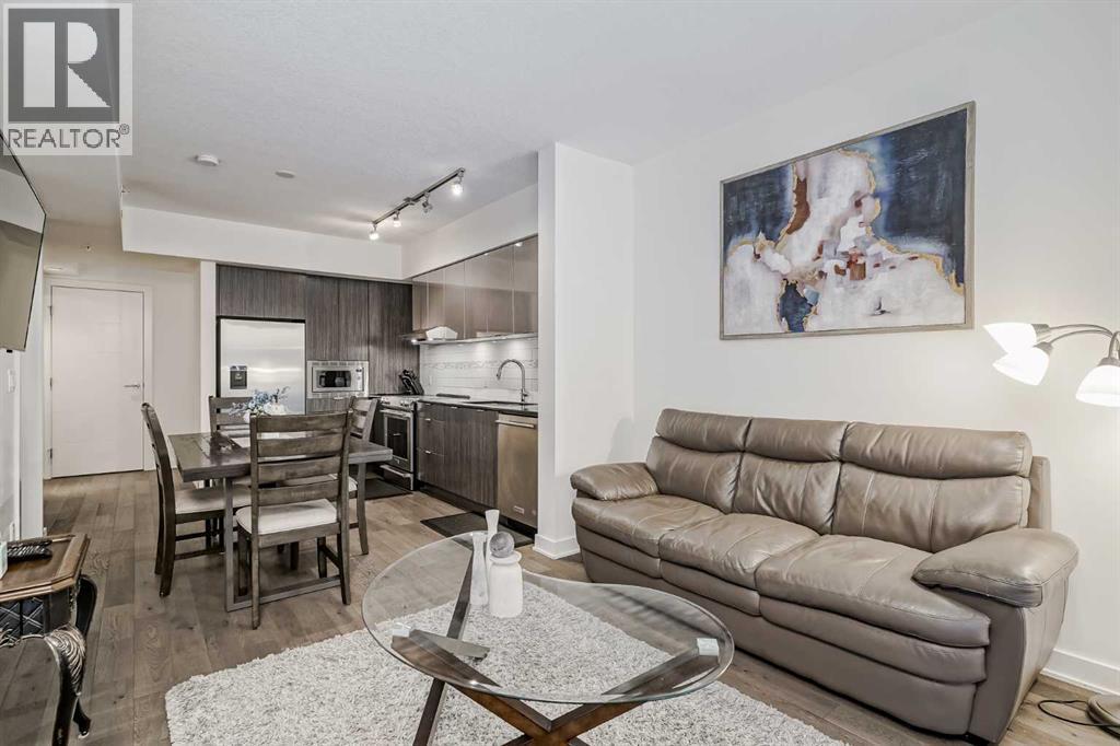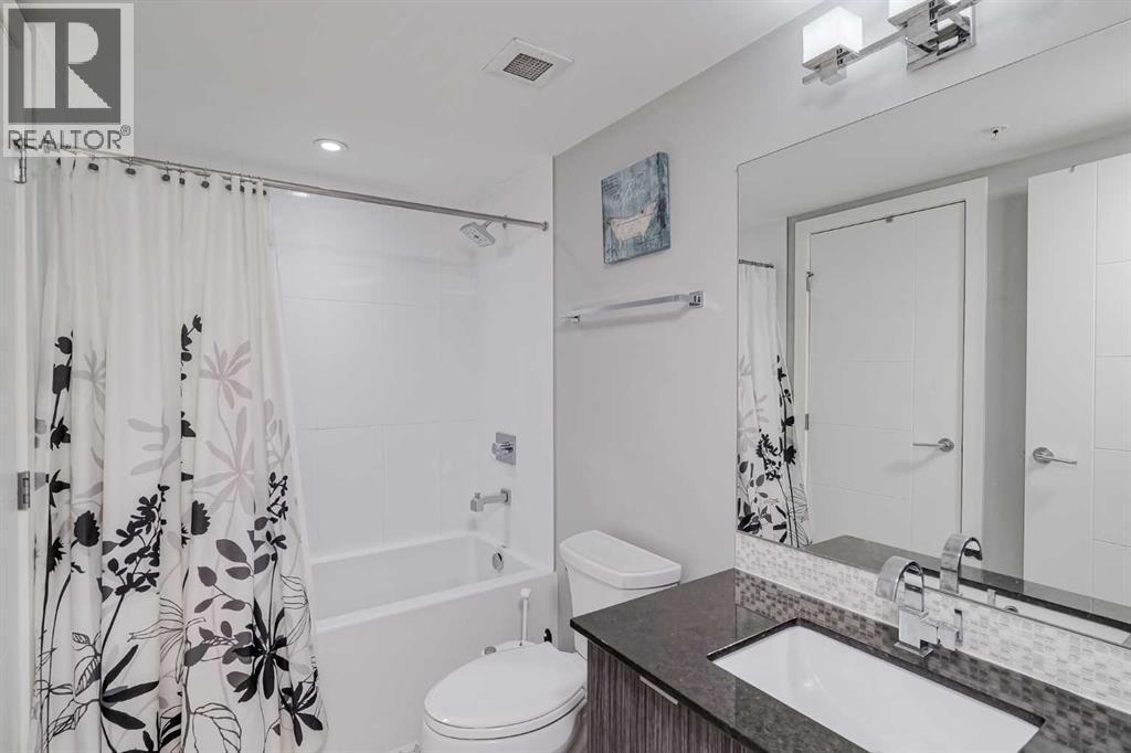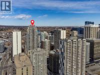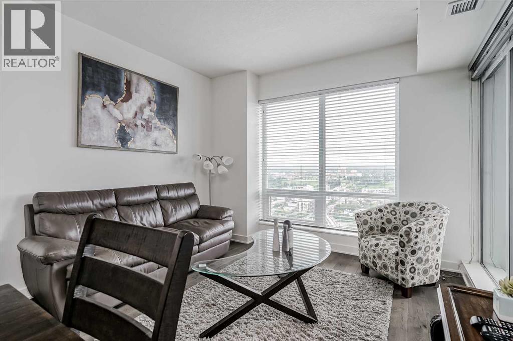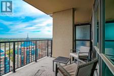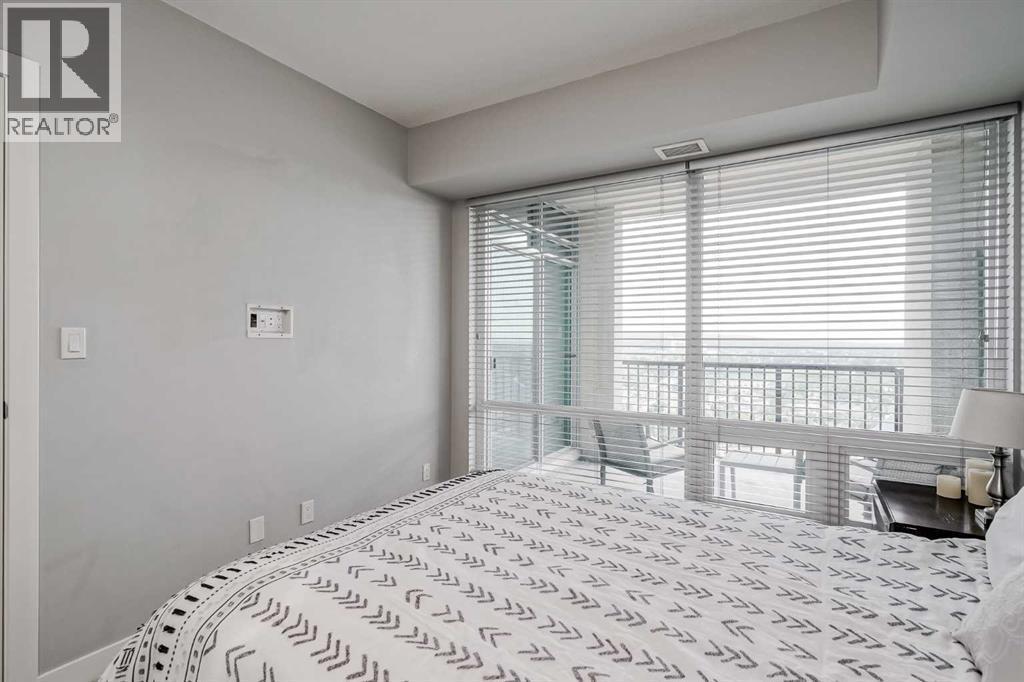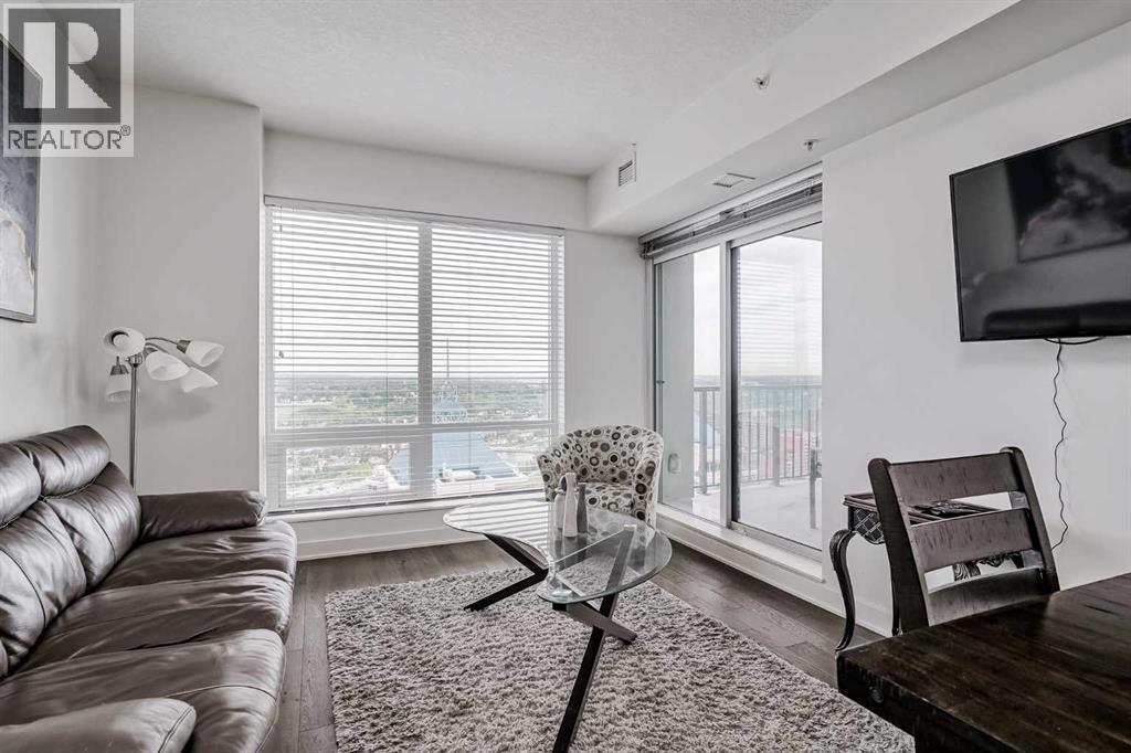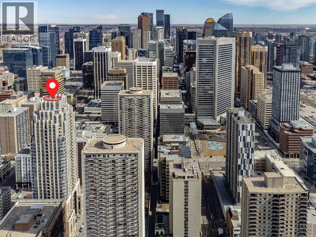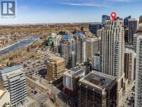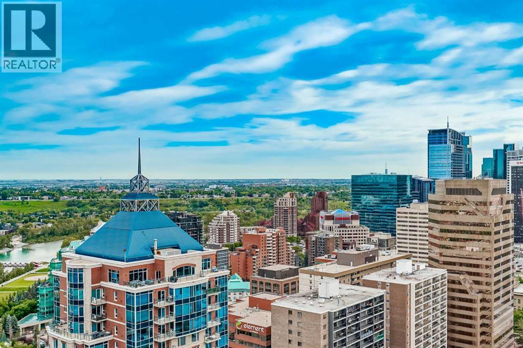 Welcome to this stunning, 1 bedroom, 1 bathroom home on the 33rd floor of one of Calgary's most sought after buildings, Vogue! If you have ever wondered what the downtown skyline and Bow River look like from 33 stories above the ground, this is the unit for you! As you walk in you are greeted with gorgeous dark wood floors, starting with a flex area that is great for an office space or additional storage. The open floor plan features a large kitchen with quartz counter tops, stainless steel appliances, a ton of cabinets and drawers and allows for an eat in kitchen experience. The dining area flows into your living room with floor to ceiling windows giving you UNOBSTRUCTED VIEWS OF THE BOW RIVER as well as MOUNTAIN VIEWS from the balcony. The balcony is a good size and offers great outdoor space. The bedroom is large enough for all of your bedroom furniture and features a walk through closet with in unit laundry and direct access to your full bathroom. The Drake is truly one of Calgary's gems of a building giving luxury hotel vibes, bicycle storage, fitness centre, recreation room, roof deck, and secured parking. This unit has a titled underground parking stall and assigned storage locker. This building is in a great location with being steps from the riverwalk, shops, cafe's, restaurants, parks, pathways and transit. Do not miss out on this opportunity to own one of the highest units with river views in the entire city. (id:6769)