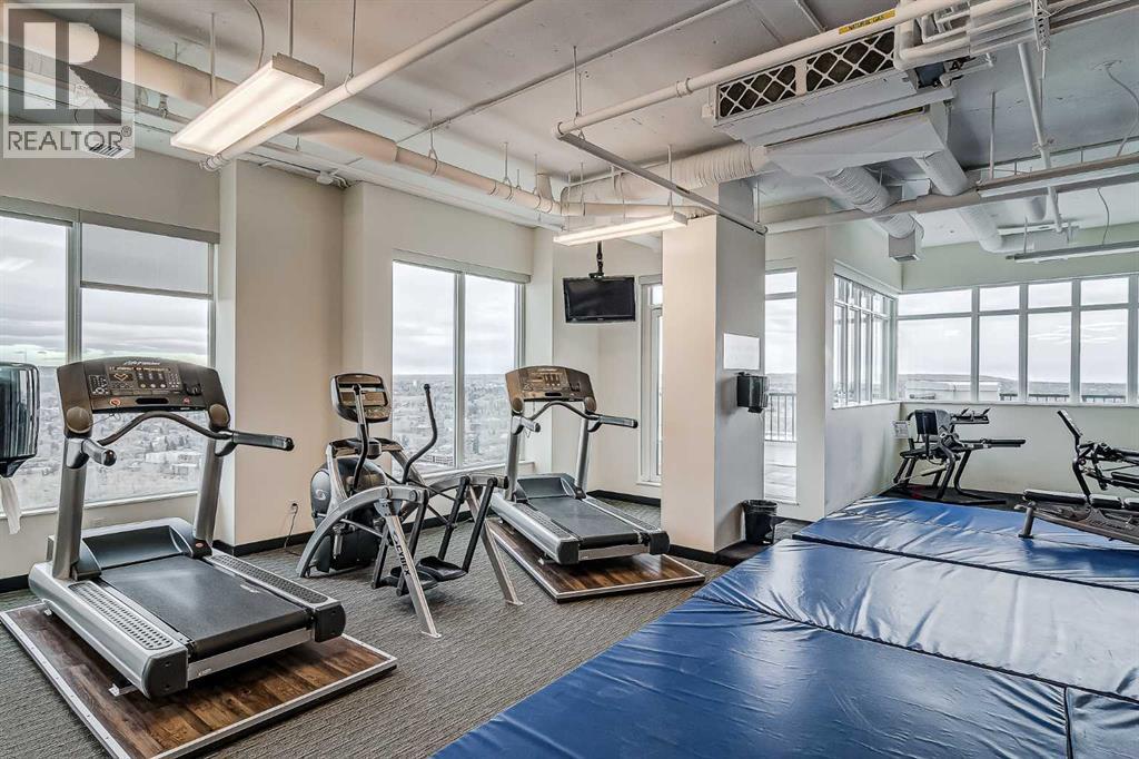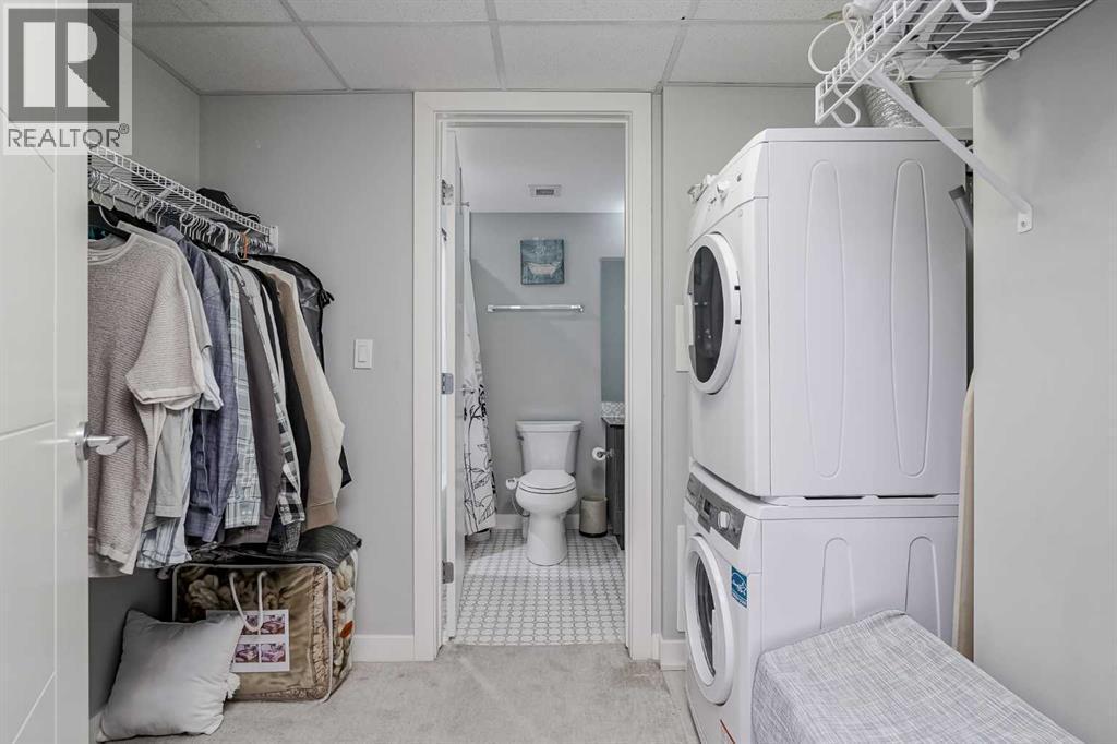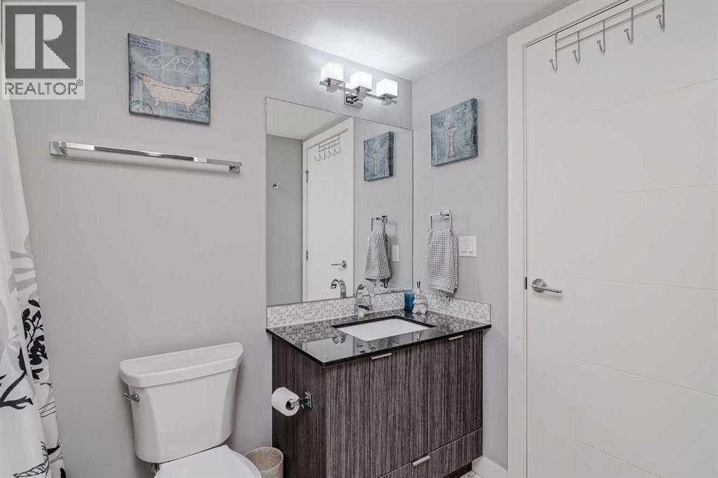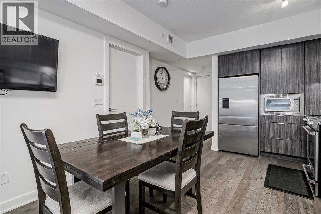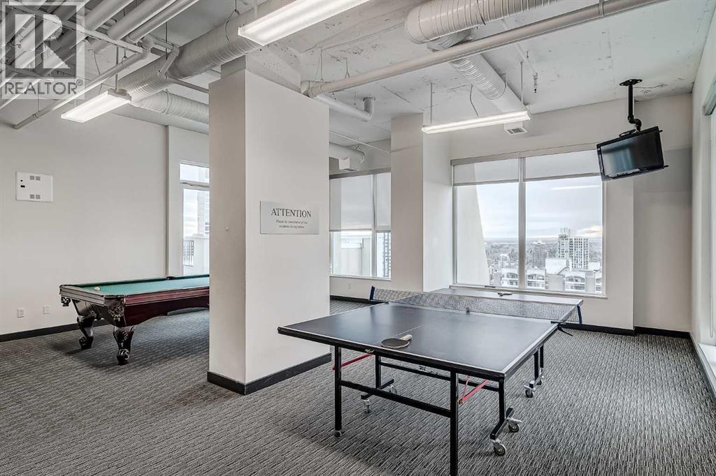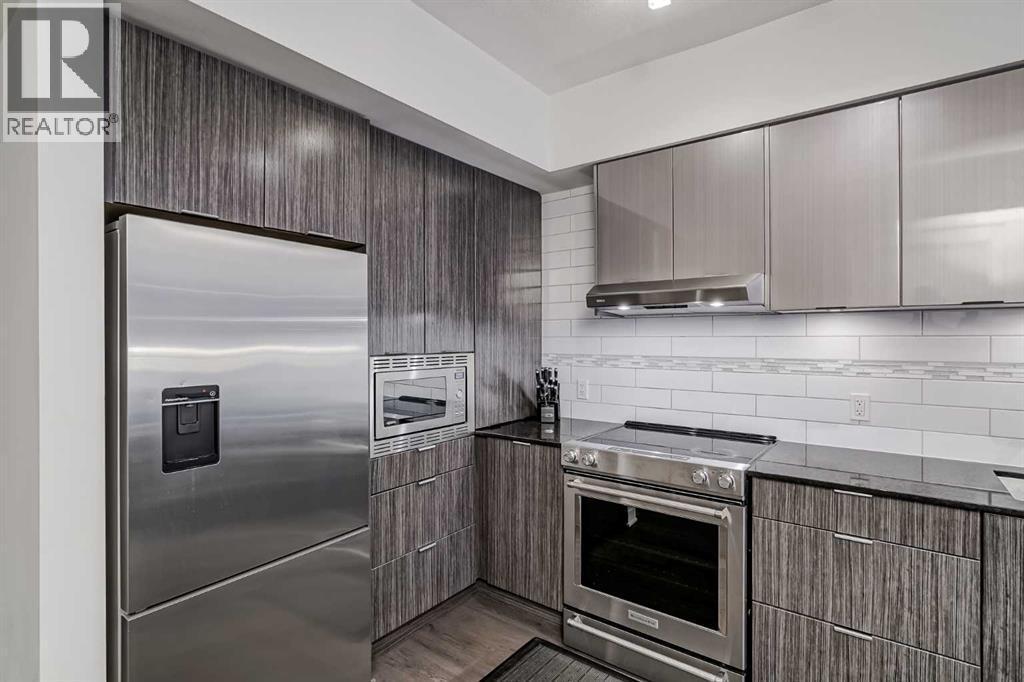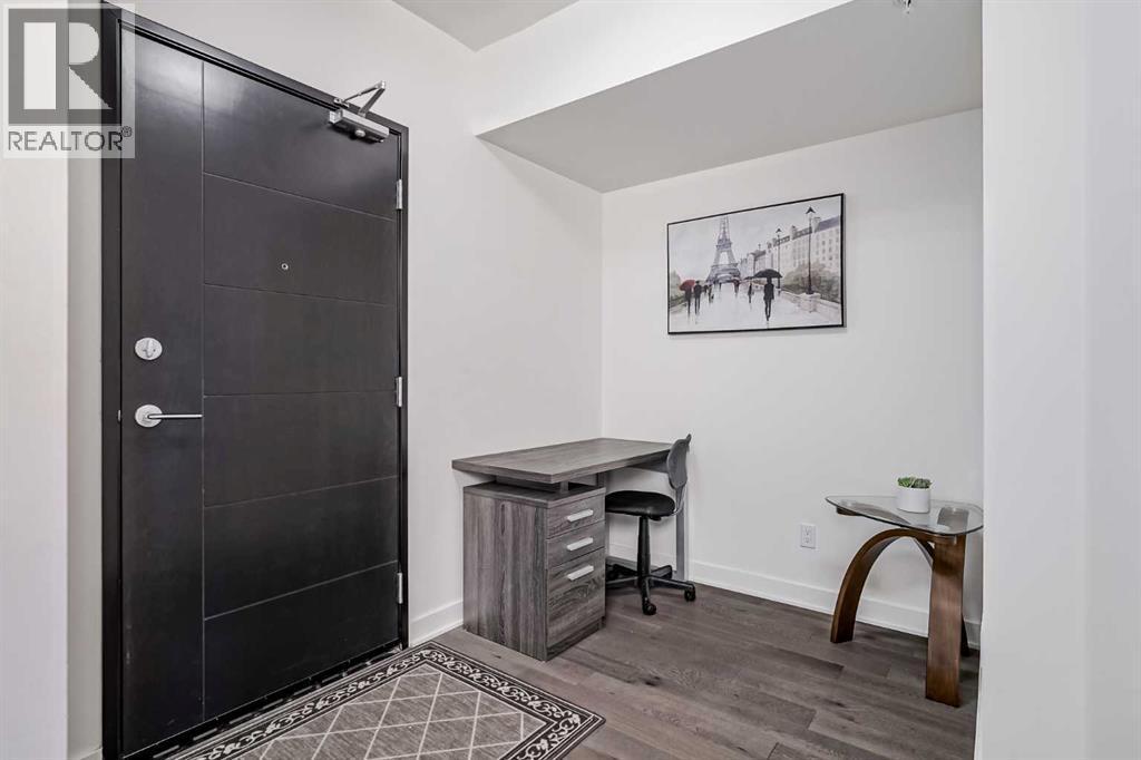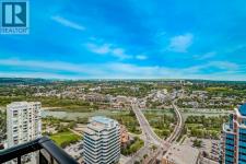 Welcome to this stunning, 1 bedroom, 1 bathroom home on the 33rd floor of one of Calgary's most sought after buildings, Vogue! If you have ever wondered what the downtown skyline and Bow River look like from 33 stories above the ground, this is the unit for you! As you walk in you are greeted with gorgeous dark wood floors, starting with a flex area that is great for an office space or additional storage. The open floor plan features a large kitchen with quartz counter tops, stainless steel appliances, a ton of cabinets and drawers and allows for an eat in kitchen experience. The dining area flows into your living room with floor to ceiling windows giving you UNOBSTRUCTED VIEWS OF THE BOW RIVER as well as MOUNTAIN VIEWS from the balcony. The balcony is a good size and offers great outdoor space. The bedroom is large enough for all of your bedroom furniture and features a walk through closet with in unit laundry and direct access to your full bathroom. The Drake is truly one of Calgary's gems of a building giving luxury hotel vibes, bicycle storage, fitness centre, recreation room, roof deck, and secured parking. This unit has a titled underground parking stall and assigned storage locker. This building is in a great location with being steps from the riverwalk, shops, cafe's, restaurants, parks, pathways and transit. Do not miss out on this opportunity to own one of the highest units with river views in the entire city. (id:6769)
