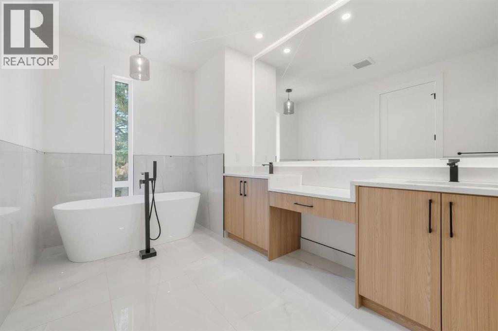 Gorgeous new 3 bedroom home built by Royal Design Homes on a quiet cul-de-sac in sought after Richmond, offering over 2000 sq ft of living space plus a self contained legal 2 bedroom basement suite. The bright & airy main level presents engineered hardwood floors, high ceilings & stylish light fixtures, showcasing the front dining area with beautiful feature wall & ample space to host family & friends. Create culinary masterpieces in the kitchen that’s tastefully finished with contrasting quartz counter tops, large island/eating bar, excellent appliance package & plenty of storage space, including a pantry & lovely built-in banquette. The living room is anchored by a floor to ceiling feature fireplace & built-ins. A cozy office space is tucked away just off the kitchen, perfect for a home office setup. Completing the main level is a convenient mudroom with bench, hooks & storage & a 2 piece powder room with wall paper accent & raised stone sink. Ascend the lighted staircase to the second level that hosts a loft/bonus room, 2 bedrooms, 4 piece bath & laundry room with sink & storage. The primary bedroom with vaulted ceiling boasts an outstanding walk-in closet & posh 5 piece ensuite with dual sinks, make-up vanity, relaxing freestanding soaker tub & rejuvenating steam shower. The fully contained legal basement suite features engineered hardwood floors, a large living/dining area with tons of built-in storage, kitchen with island/eating bar, quartz counter tops & stainless steel appliances. Two bedrooms, a 4 piece bath & dedicated laundry facilities complete the legal basement suite. Other notable features include roughed in air conditioning & 2 furnaces. Outside, enjoy the beautifully landscaped front garden & back yard with deck & access to a double detached garage. The location is incredibly convenient, close to vibrant Marda Loop, excellent schools, parks, public transit & easy access to 26th Avenue & Crowchild Trail. (id:6769)